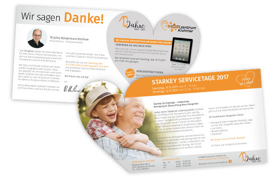 Wir empfehlen bei dem Ohr-Beileger, den Fokus auf diskrete Im-Ohr-Hörgeräte zu setzen, um Interessenten eine geringe Schwelle zur Anmeldung zu bieten und den Flyer mit einem Teamfoto aufzuwerten, um den persönlichen Service herauszustellen.